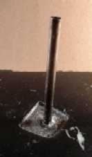 Because the black marble is only a thin slab, the underside is reinforced with a metal plate to which the rod is welded. The whole metal assembly is then fitted and cemented to the marble with epoxy.